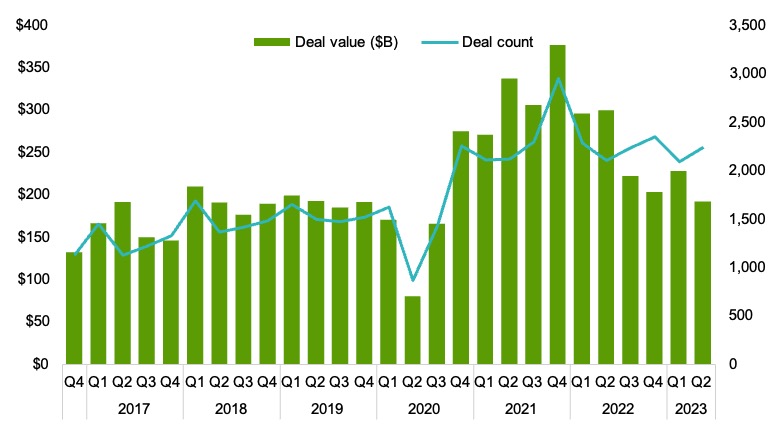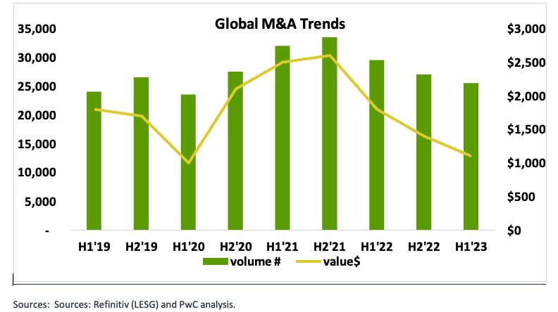 According to PwC, the value of global M&A deals in the first half of 2023 (1H23) was down 39% vs. 1H22 and down 56% vs. 1H21. Deal volume was down 14% in 1H23 vs. 1H22 and down 20% vs. 1H21.