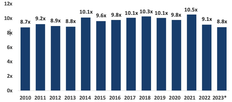 According to PitchBook, EBITDA multiples in North America and Europe in 1Q 2023 decreased by 16% from the peak in 2021 and back to levels not seen since 2013.