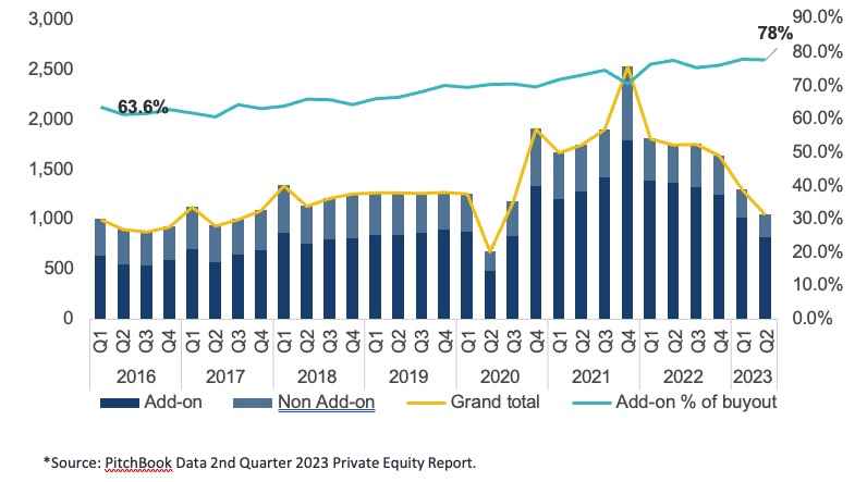According to PitchBook, the percentage of private equity deals representing add- on acquisitions by existing portfolio companies as compared to acquisitions of platform companies accelerated to 78% in 2Q 2023. While the primary cause is likely the continued benefit of multiple arbitrage, this also demonstrates the relative strength of the lower middle market as compared to the core and upper middle market segments where companies are much more impacted by higher interest rates, tightening credit markets and other macroeconomic factors.