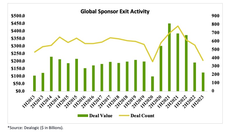 According to Dealogic, global private equity exits slowed down dramatically beginning in 2022 and into 1H23 as the impact of rising interest rates and unsettled debt markets has taken its toll on M&A activity.