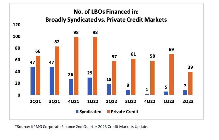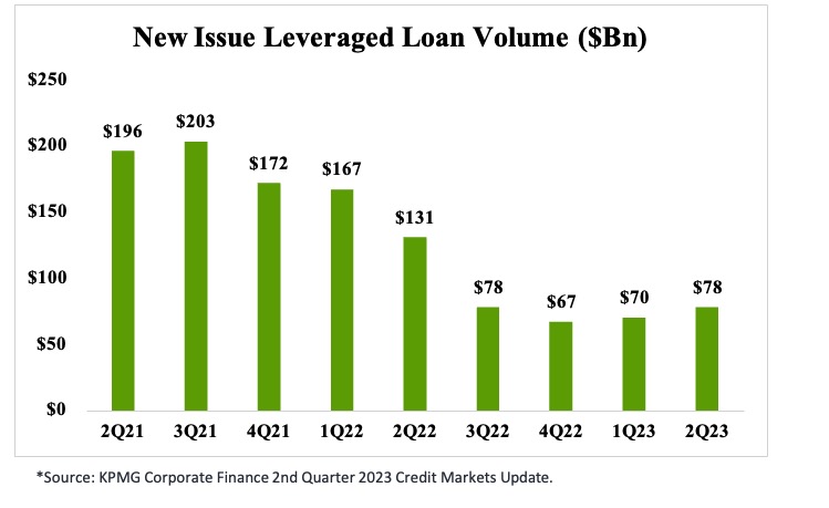 According to KPMG, new issue leveraged loan volume in 2Q23 reached $77.9 billion, down 41% from the $131.3 billion in volume in 2Q22 but the highest in the past three quarters.