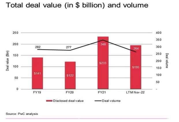 In the 12 months ended Nov. 2022 (LTM Nov22), both deal value ($195 billion) and deal volume (264) in transportation and logistics (T&L) declined when